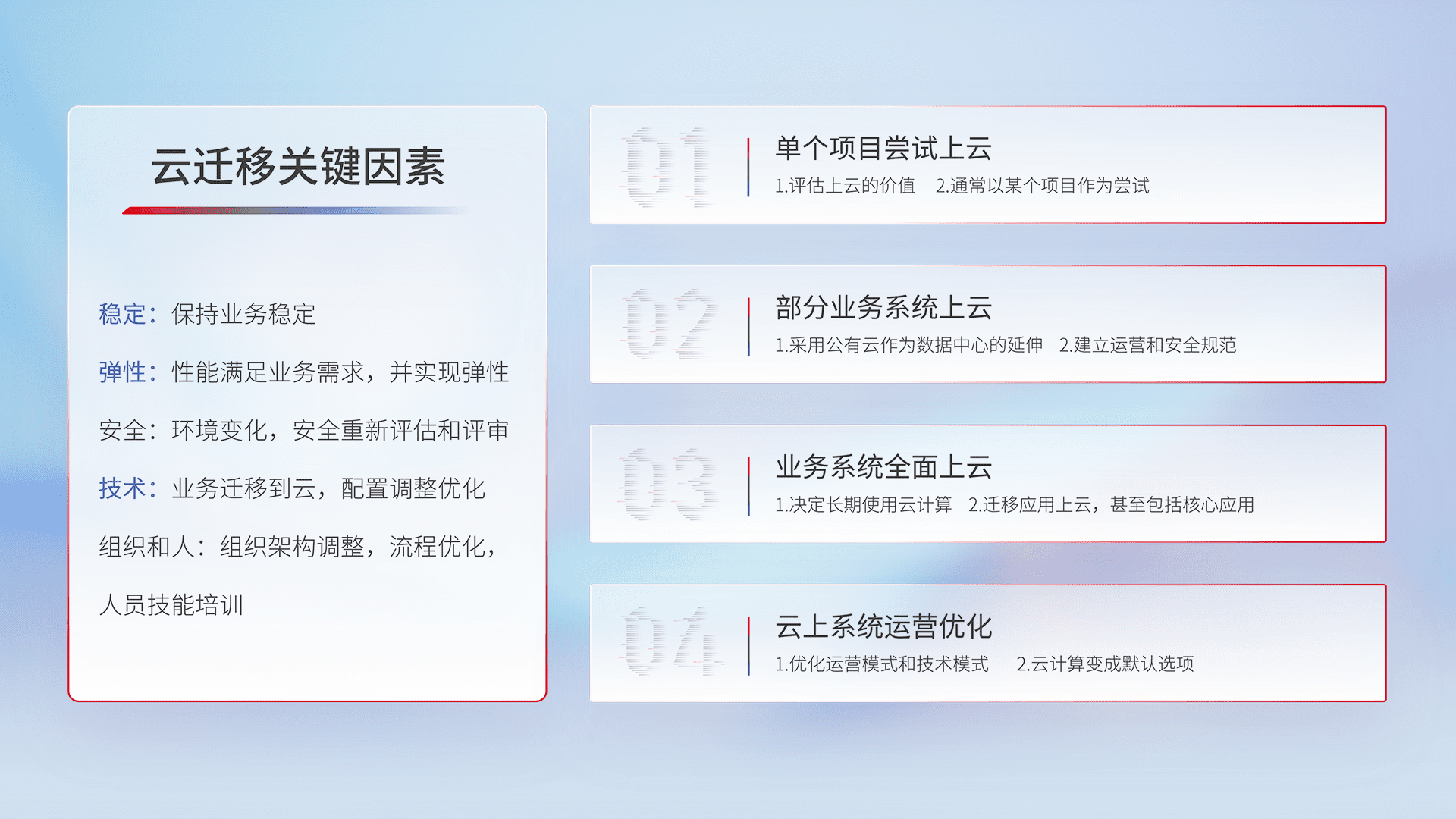 结合实际业务,,,从规划设计、、云平台选型、、、云原生改造、、、数据迁移、、、、集成交付,,迁移全过程为客户识别最佳上云路径,,,做好风险识别管理,,设计网络架构、、、、身份权限、、安全审计合规、、、操作审计、、、日志审计、、、监控告警策略、、多站点容灾设计等,,对云上基础设施进行整体规划,,提升IT治理水平,,,以满足弹性、、、、高可用、、、高性能的需求。。。。